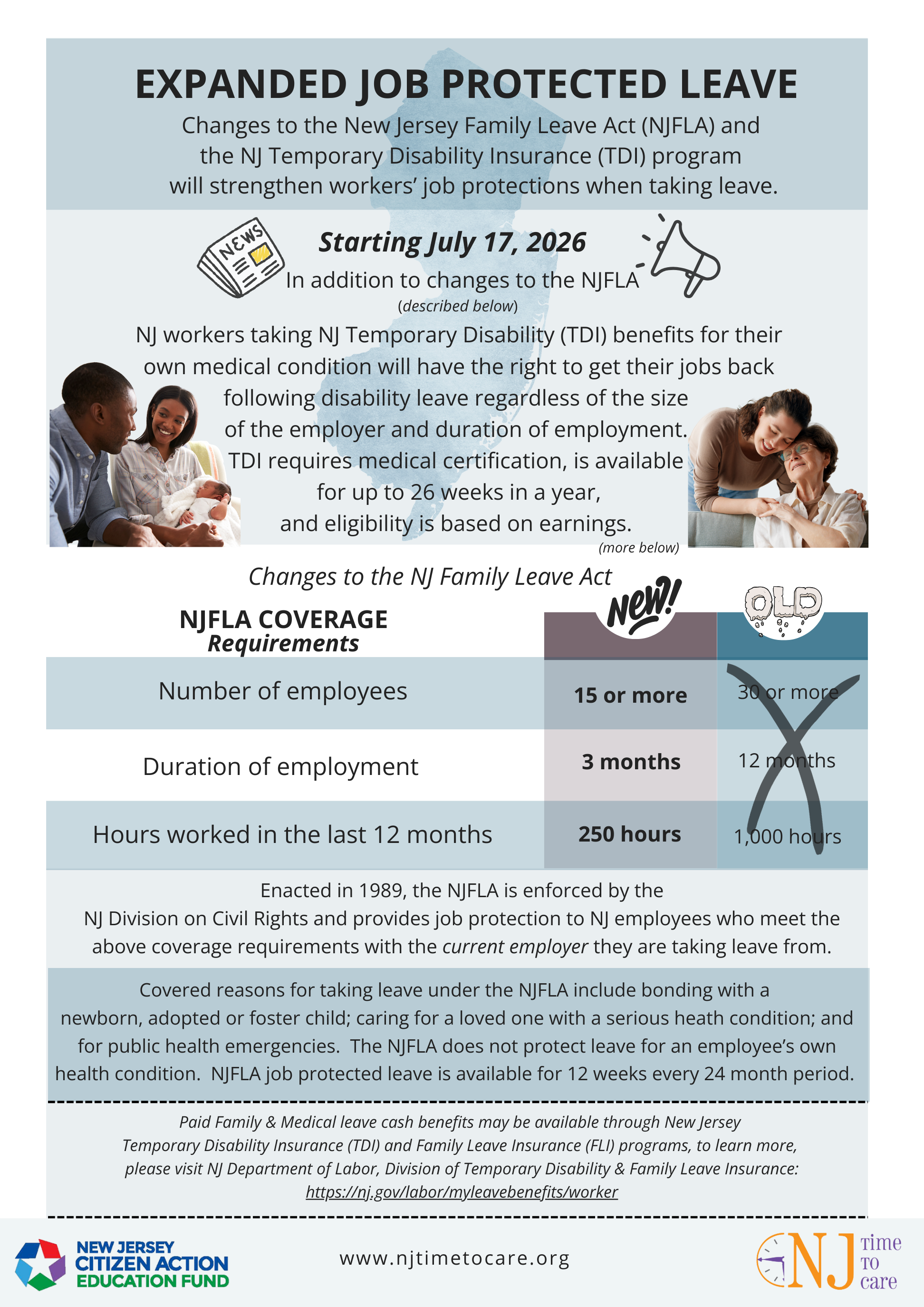 The distinction between eligibility for New Jersey’s paid famly leave program, Family Leave Insurance (FLI) and the two laws that cover job protection eligibility — NJFLA and FMLA are complicated, confusing and leave huge gaps in coverage. Click to see the graphic breakout